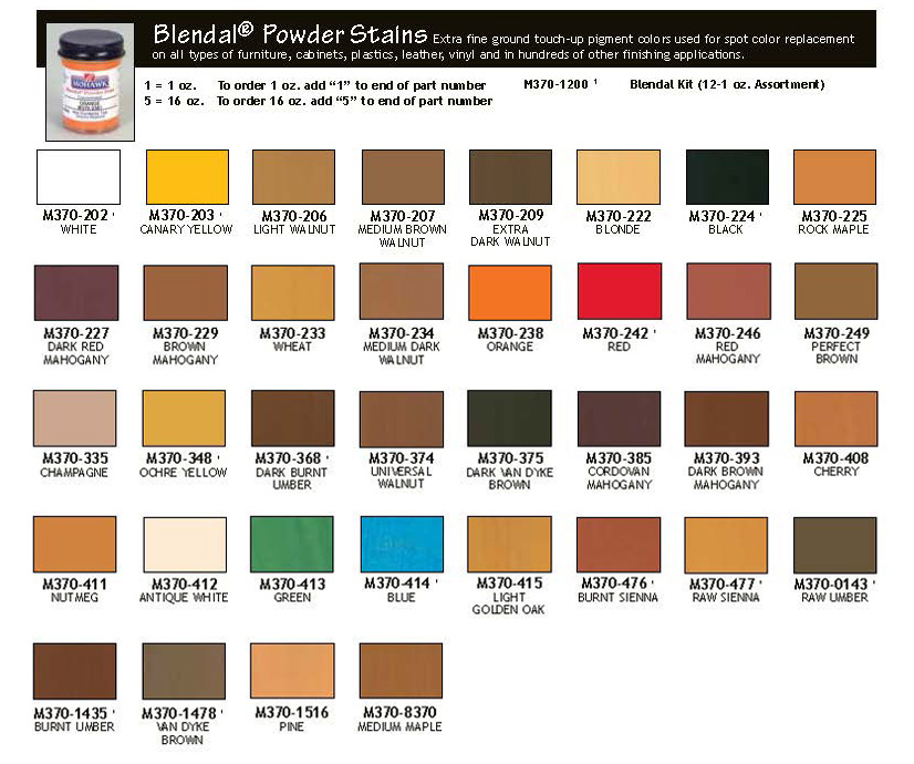 Extra fine ground touch-up pigment colors used for spot Color replacement on all types of furniture, cabinets, plastics, leather, vinyl and in hundreds of other finishing applications. Best results are obtained when applied with Lacover Padding Finish. Compatible with various other padding agents, French Polish, lacquer, shellac, varnish, synthetic finishes and Graining Liquid. Apply with a padding pad or brush. Sold by volume measure. Custom color matching available
