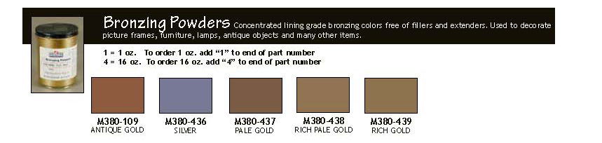 Concentrated lining grade bronzing colors free of fillers and extenders. Used to decorate picture frames, furniture, lamps, antique objects and many other items. For extra bright effects, highlighting is effective. Raised portions of a frame can be burnished to a higher luster thus creating a contrast with the rest of the work. Packaged by volume.